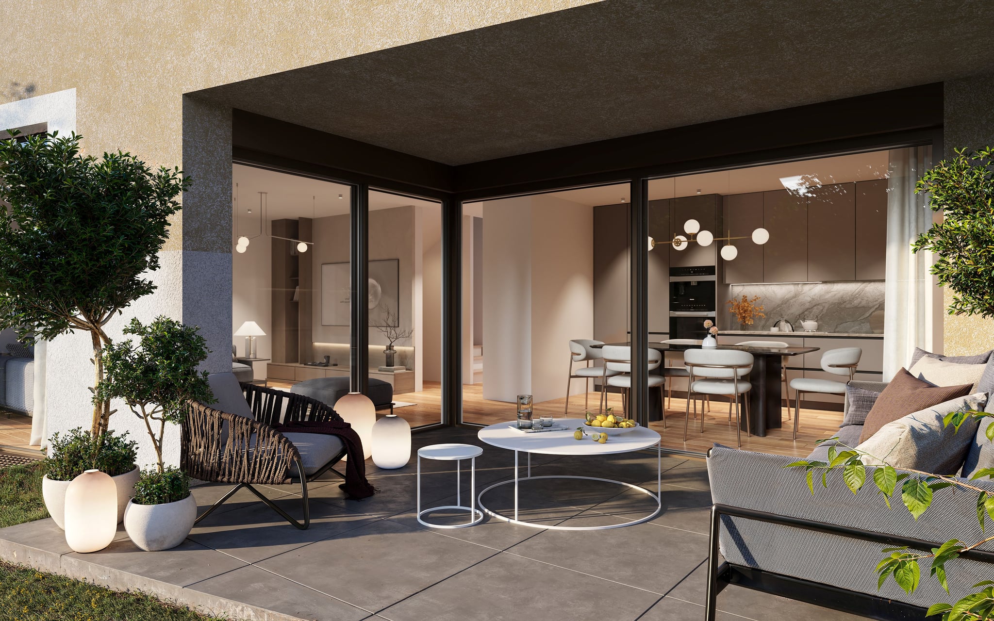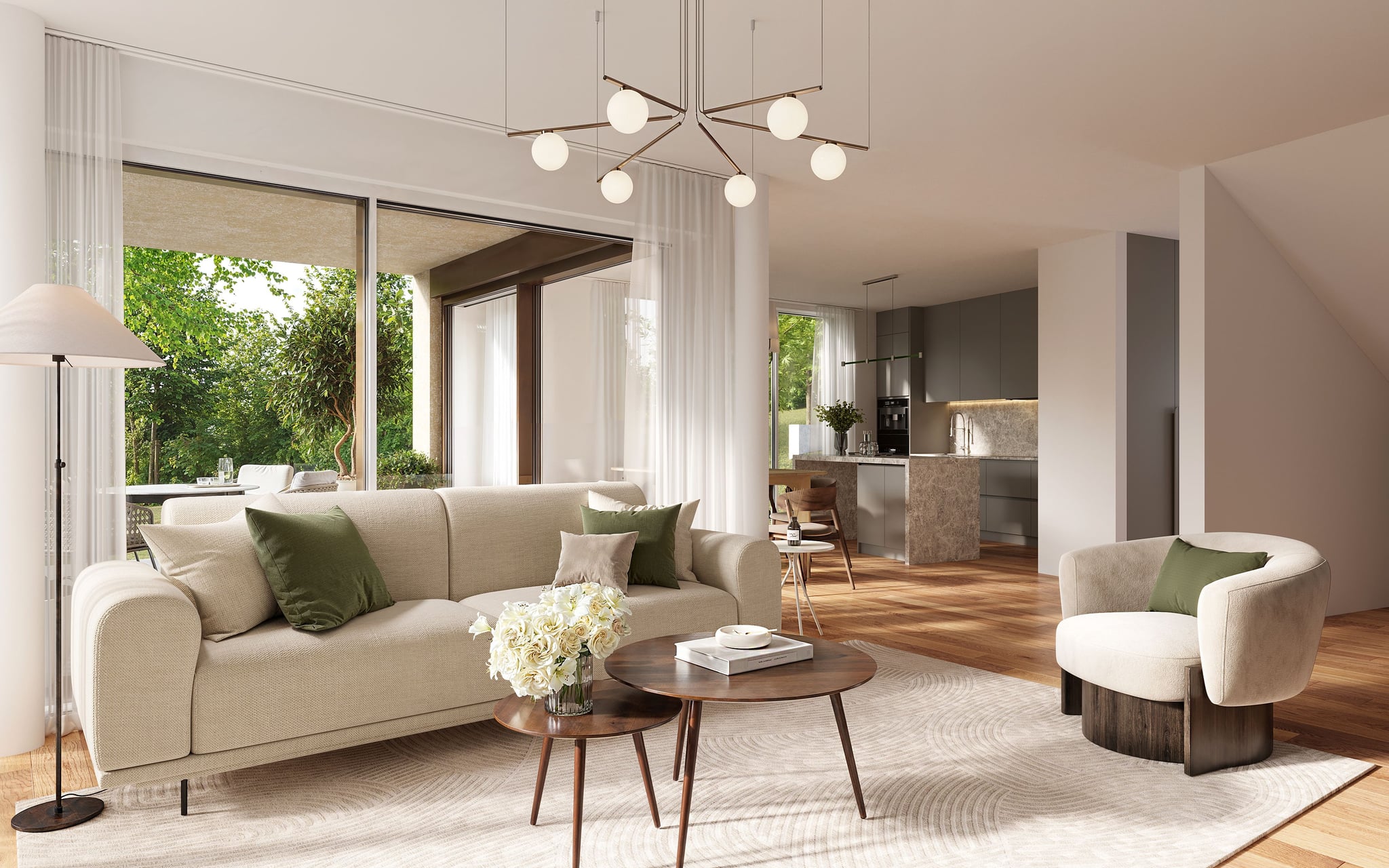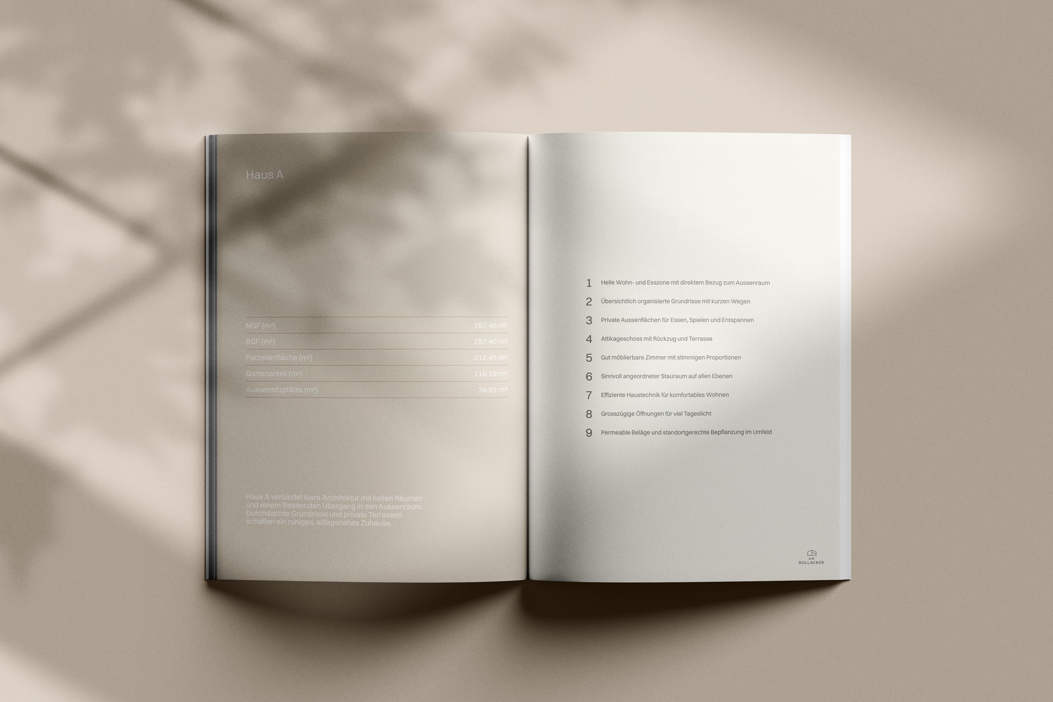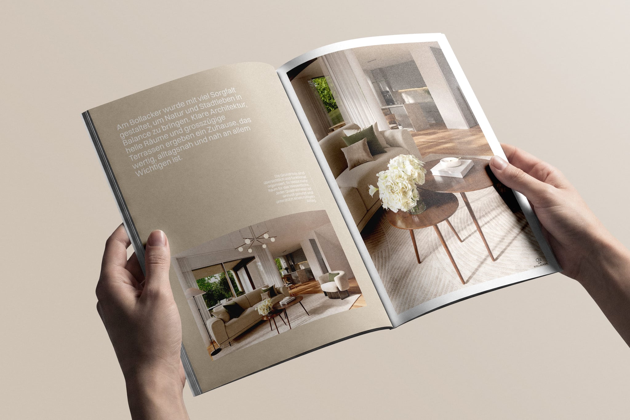 Für Am Bollacker haben wir ein Set an photorealistischen 3D Visualisierungen für Außen- und Innenbereiche erstellt. Die Außenansichten zeigen die Baukörper realitätsnah in Topografie und Umfeld eingebettet, während die Innenräume in einem warmen, neutralen Stil eingerichtet wurden, der die Architektur unterstützt und eine glaubwürdige Atmosphäre schafft. Zusätzlich haben wir das Projekt Exposé gestaltet und gesetzt, sodass Visualisierungen und Inhalte in einem klaren, konsistenten Dokument für digitale Nutzung und Druck zusammengeführt sind.