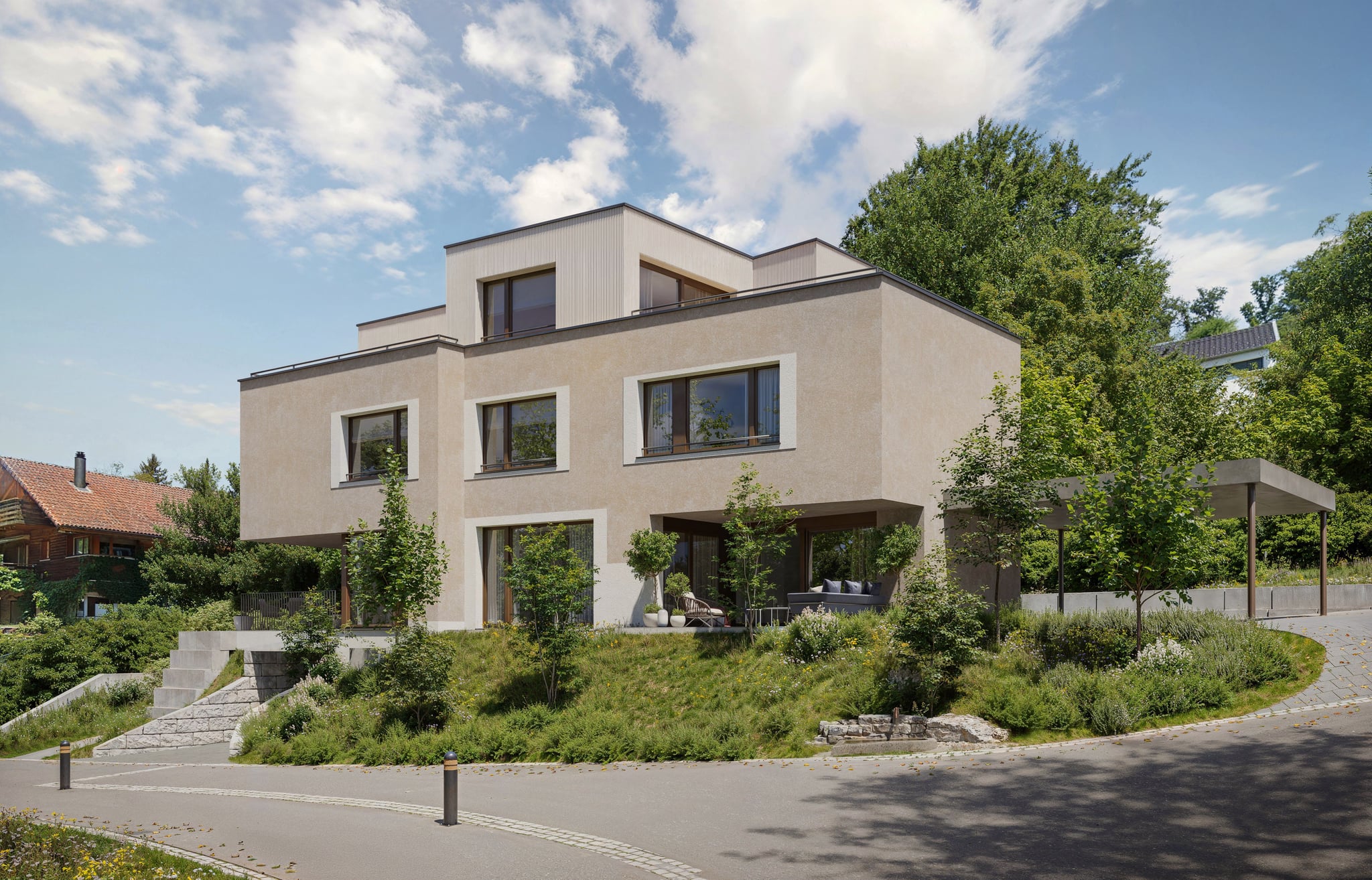 Am Bollacker ist ein Wohnbauprojekt in Küttigen, Schweiz, bestehend aus zwei miteinander verbundenen Reihenhäusern, eingebettet in eine sanft geneigte Wohnlage. Die Architektur ist geprägt von klaren Baukörpern, zurückhaltender Materialwahl und einer starken Verbindung zwischen den Innenräumen und der umgebenden Grünstruktur.